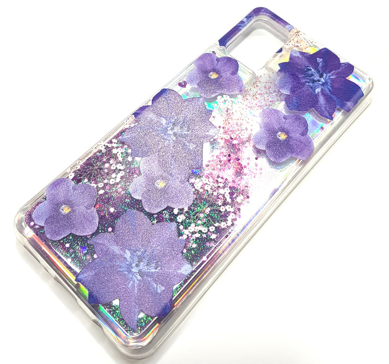 Луксозен гръб 3D Water Case за Apple iPhone 12 /12 Pro 6.1'' - течен гръб с брокат / прозрачен с лилави цветя