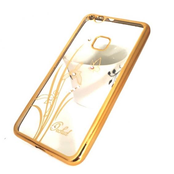 Луксозен силиконов калъф / гръб / TPU / Elegant с камъни за Huawei P10 Lite - прозрачен със златист кант / цвете / пеперуда