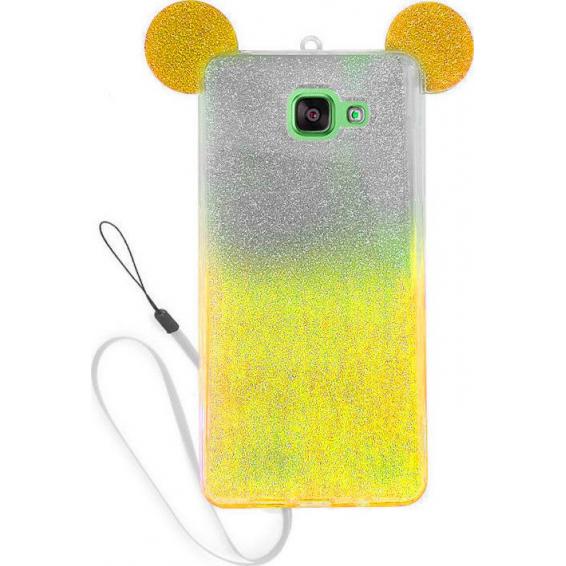 Луксозен силиконов калъф / гръб / TPU 3D за Samsung Galaxy A3 2016 A310 - жълт / прозрачен / сив брокат / миши ушички / 2в1