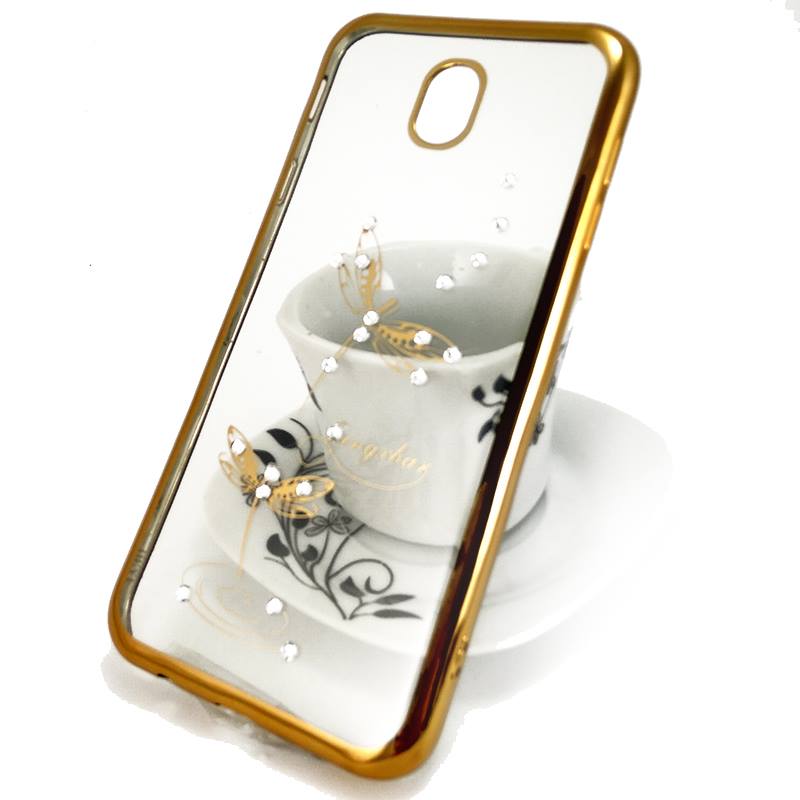 Луксозен силиконов калъф / гръб / TPU / Elegant с камъни за Samsung Galaxy J3 2017 J330 - прозрачен със златист кант / водно конче