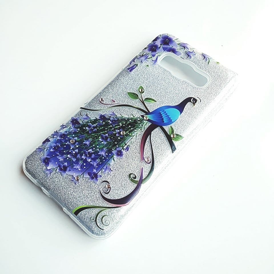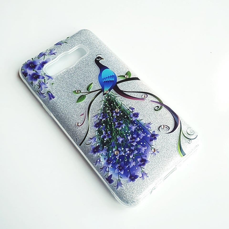 Луксозен силиконов калъф / гръб / TPU за Samsung Galaxy J5 2016 J510 - сребрист брокат / лилави цветя / паун