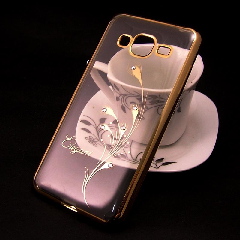 Луксозен силиконов калъф / гръб / TPU / Elegant с камъни за Samsung Galaxy J5 J500 - прозрачен със златист кант / перо