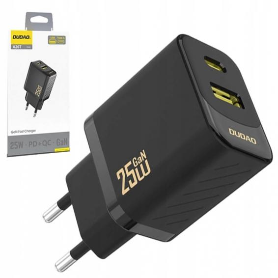 Зарядно устройство 220V Dudao A26T USB-A + USB-C GaN 25W - черно