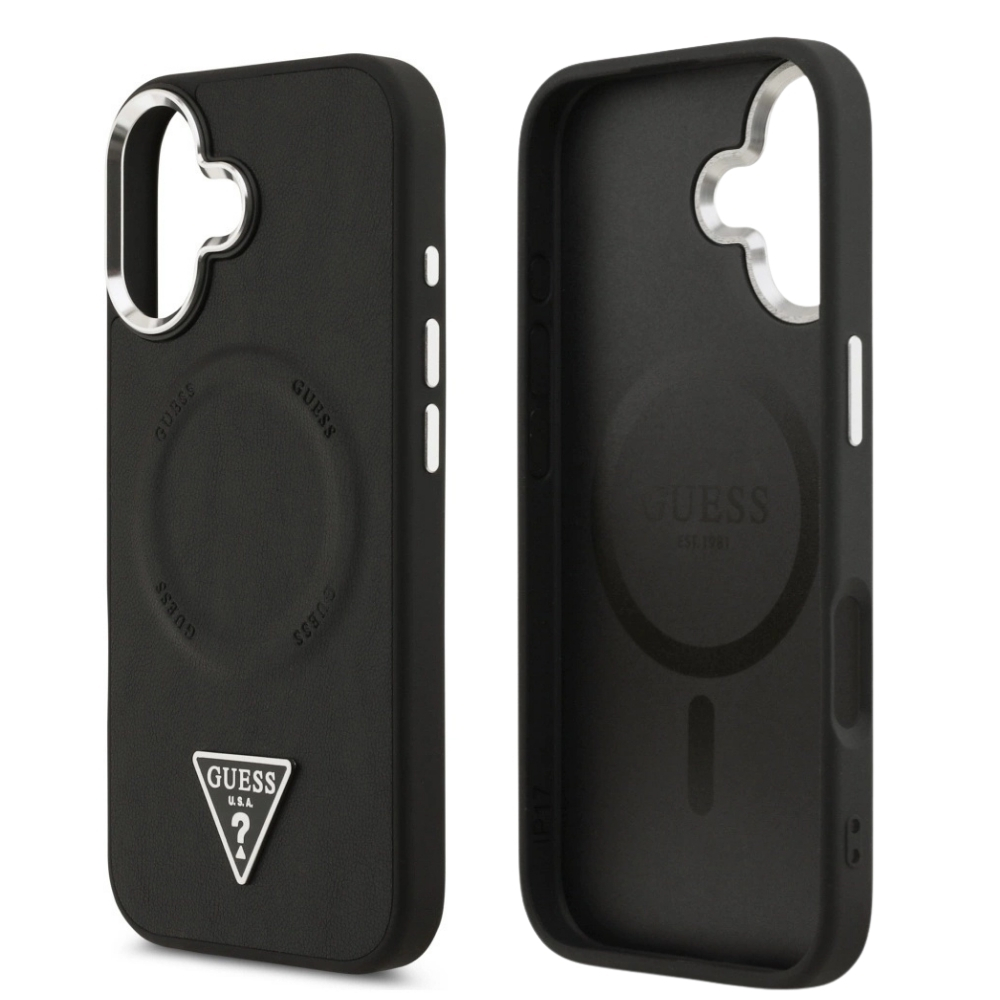 Оригинален калъф / гръб / GUESS Leather Triangle Metal Logo кейс с безжично зареждане MagSafe за Apple iPhone 17 (6.3) - черен