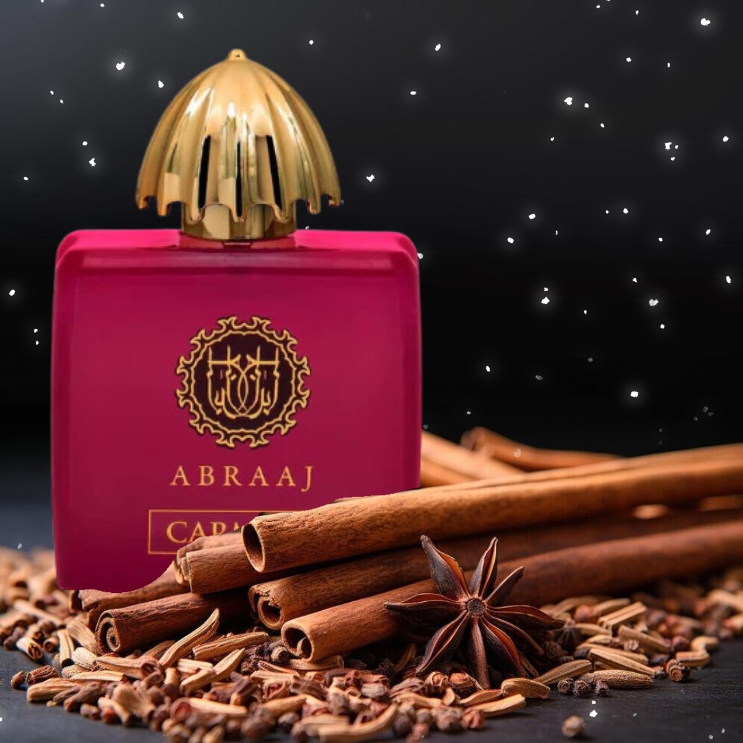 Fragrance World Abraaj Carmine започва с канела и розов пипер, последвани от мед и роза в сърцевината, завършвайки с ветивер, дъб и атласки кедър в базата.