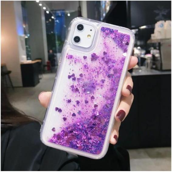 Луксозен гръб 3D Water Case за Apple iPhone 12 Mini 5.4'' - прозрачен / течен гръб с лилав брокат / сърца