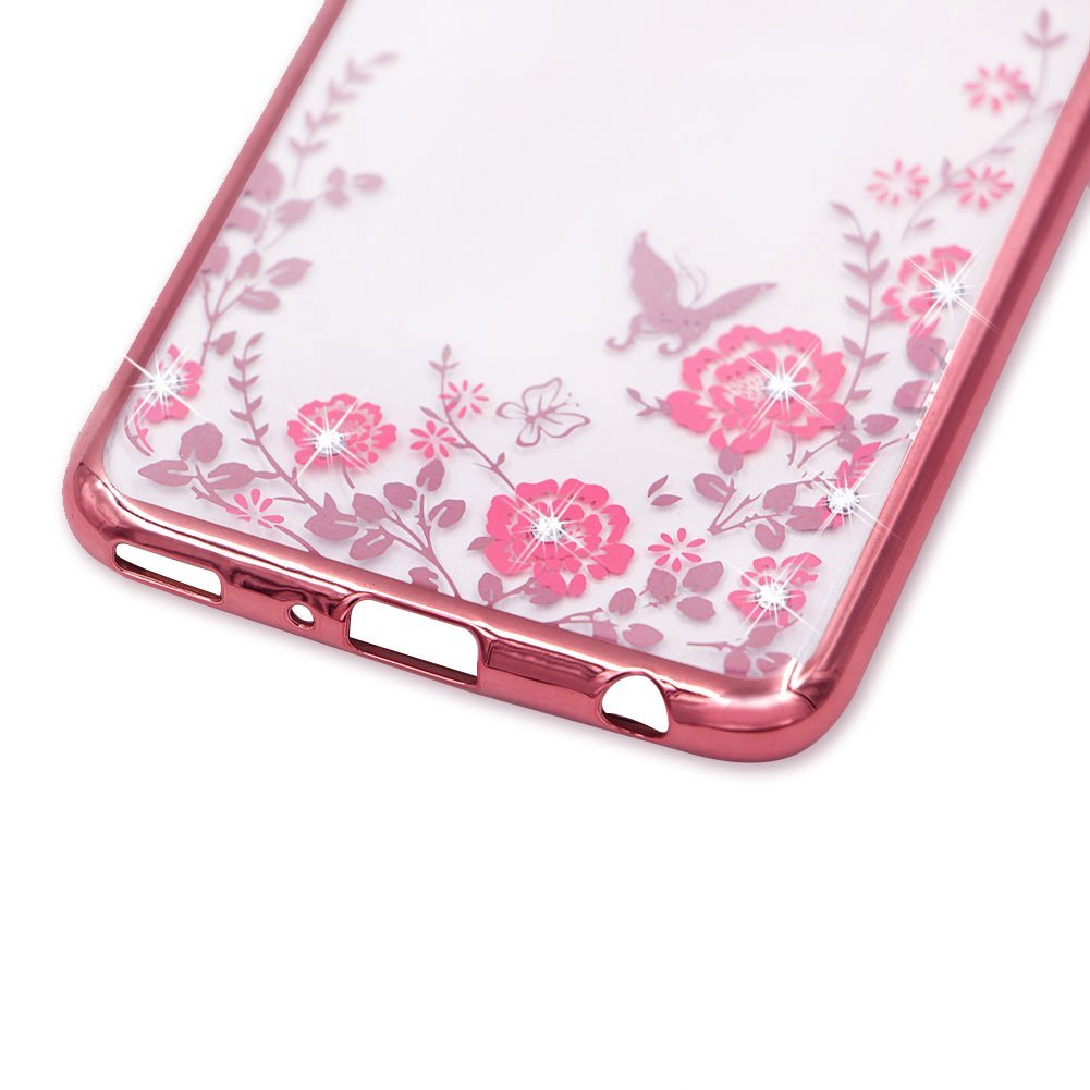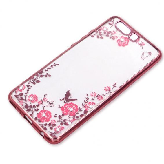 Луксозен силиконов калъф / гръб / TPU с камъни за Huawei P10 Plus - прозрачен / розови цветя / Rose Gold кант