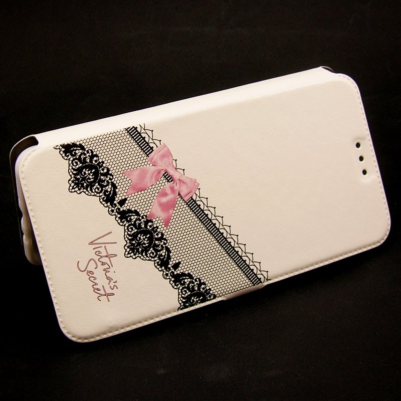 Кожен калъф Flip тефтер Flexi със стойка за Apple iPhone 6 / iPhone 6S - бял / розова панделка / Victoria`s Secret