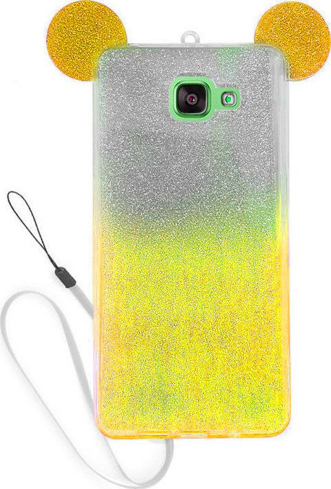 Луксозен силиконов калъф / гръб / TPU 3D за Samsung Galaxy A3 2016 A310 - жълт / прозрачен / сив брокат / миши ушички / 2в1