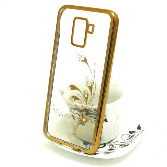 Луксозен силиконов калъф / гръб / TPU / Elegant с камъни за Samsung Galaxy J6 Plus 2018 - прозрачен със златист кант / перо