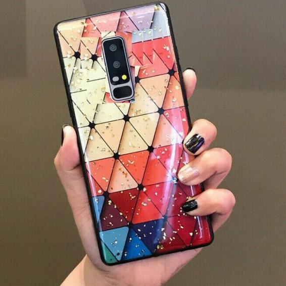 Луксозен стъклен твърд гръб за Xiaomi Redmi Note 8 Pro - многоцветни триъгълници / блестящи частици